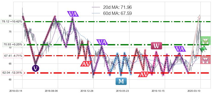 ♘ 支撑价格位67.41,可信任强度84.28%,距离最后交易2020-03-13形成的收盘价格70.75相差 -4.71%