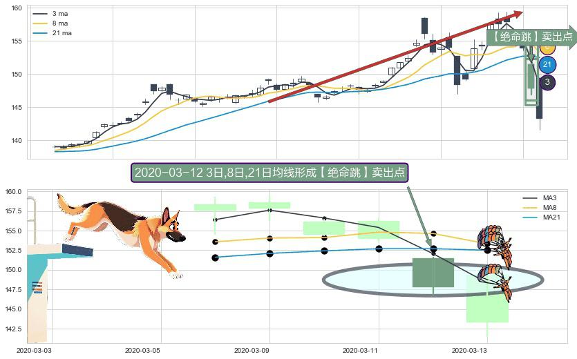 ⚀ 2020-03-12日显现 3日-8日-21日均线 【绝命跳】卖出点 看空信号,后市看跌,卖出