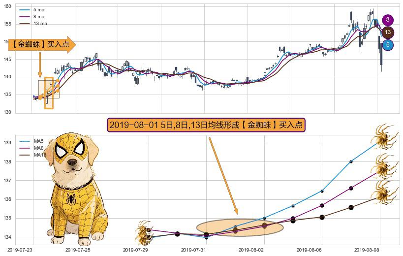 ⚀ 2019-08-01日显现 5日-8日-13日均线 【金蜘蛛】买入点 看多信号,后市看涨,买入