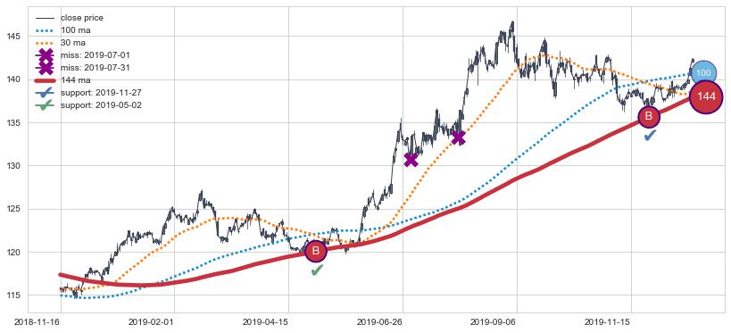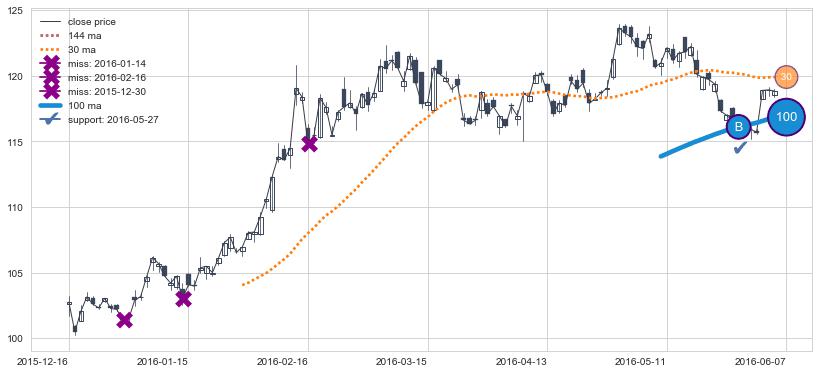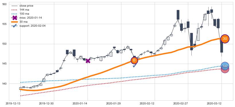 ⚁ MA3和MA8走势平行,且始终保持在短距离内,MA21始终在短中期均线下方,与短中期均线保持一定的距离,微微上行