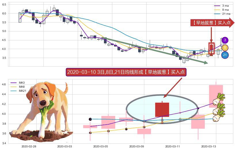 形态多维评估: ⚀ 2020-03-10日显现 3日-8日-21日均线 【旱地拔葱】买入点 看多信号,后市看涨,买入