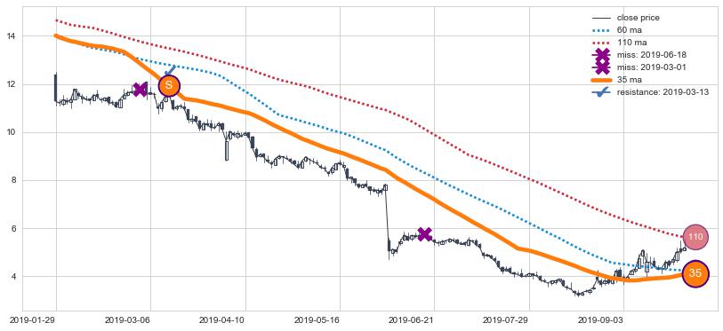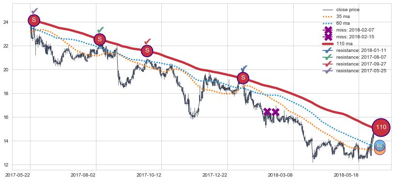 下跌趋势2017-05-22-2018-06-05,均线110确认关键阻力4处