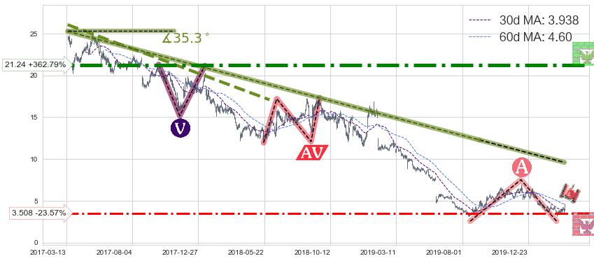 ♘ 阻力价格位21.24,可信任强度94.74%,距离最后交易2020-03-13形成的收盘价格4.59相差 +362.79%