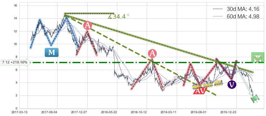 ♘ 阻力价格位7.12,可信任强度81.47%,距离最后交易2020-03-13形成的收盘价格2.230相差 +219.10%