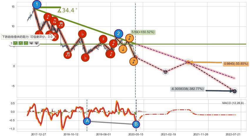 ♘ 在最后的下跌阶段2017-09-11至2020-03-13,存在 持续未破位的阻力位 ,阻力价格5.59,可信任强度75.23%,其距离最后价格2.230相差 +150.52%