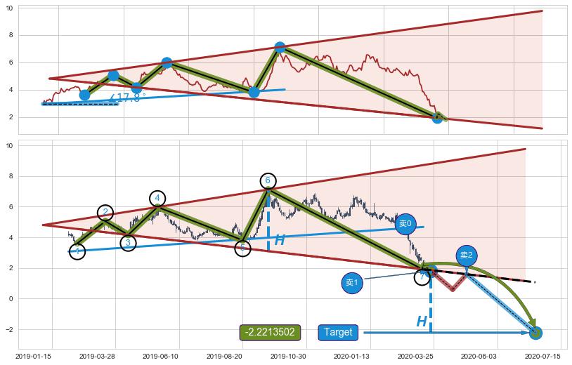 ➢ 最小反转跌幅→𝐇: 4.02 (逐步抬高阻力斜边最后的阻力点⑥与支撑边垂直距离)