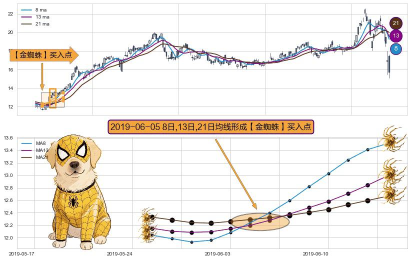 ⚀ 2019-06-05日显现 8日-13日-21日均线 【金蜘蛛】买入点 看多信号,后市看涨,买入