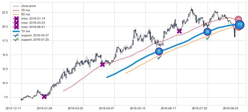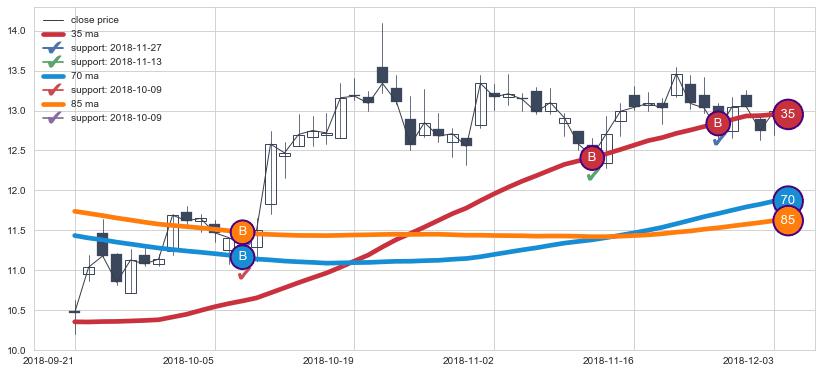 ➢ 最优均线组合共正确确认支撑阻力信号9处,正确确认率 64.29%