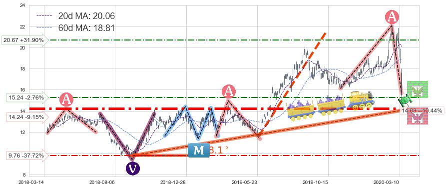 ♘ 支撑价格位14.24,可信任强度96.45%,距离最后交易2020-03-13形成的收盘价格15.67相差 -9.15%