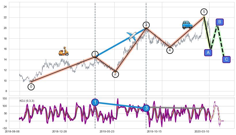 | 3 🅚:升势停顿 ➕ 🌊:波浪理论猜想上涨浪5已形成,猜想后续形成回调abc下跌(均值回复) ☞ 看空信号 ⇥ 【🅚线】交织【图形】⇥ 综合量化分数: 47 | > |