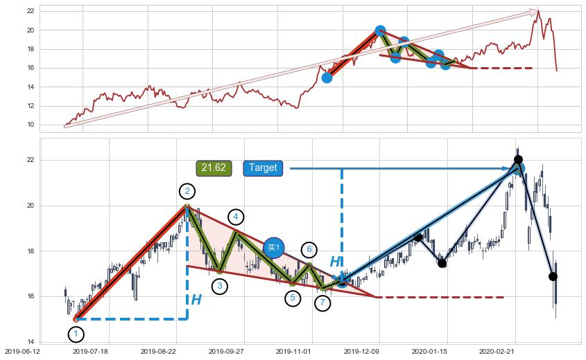 ➢ 最小中继整理涨幅→𝐇: 4.95 (𝐇楔型旗杆的长度:楔型起点→顶点)
