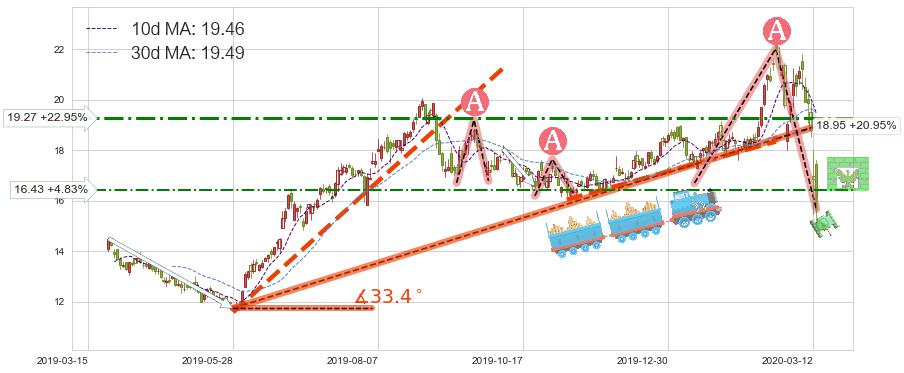 ✂️ 2019-05-28-2020-02-24上升趋势存在反转[风险],其原上升趋势的支撑位(18.95)已破位[强阻力信号],原上升趋势角度: 33.4˚