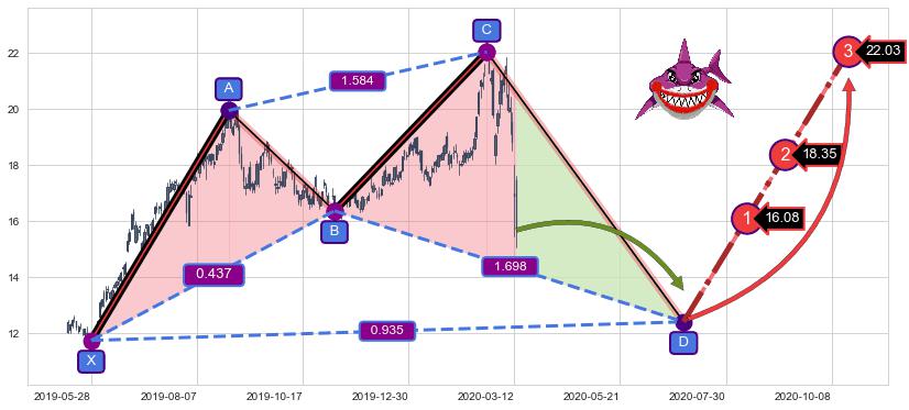 ➢ 距离预测D点位置尚有下跌空间,短线依然【看跌】, 耐心等待看涨【鲨鱼】形态反转启动