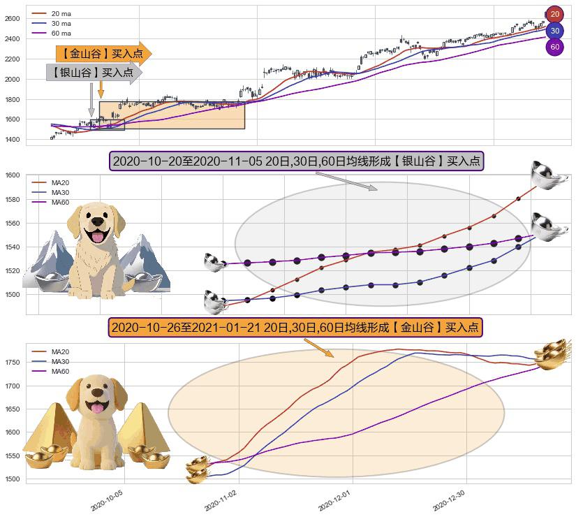 ⚀ 2020-10-27-日至2021-01-21-日显现 20日-30日-60日均线 【金山谷】买入点 其再次确认了买入信号,可靠性更强,买入