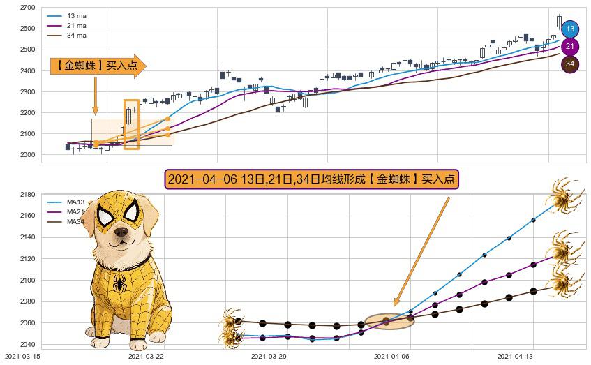 ⚀ 2021-04-06日显现 13日-21日-34日均线 【金蜘蛛】买入点 看多信号,后市看涨,买入