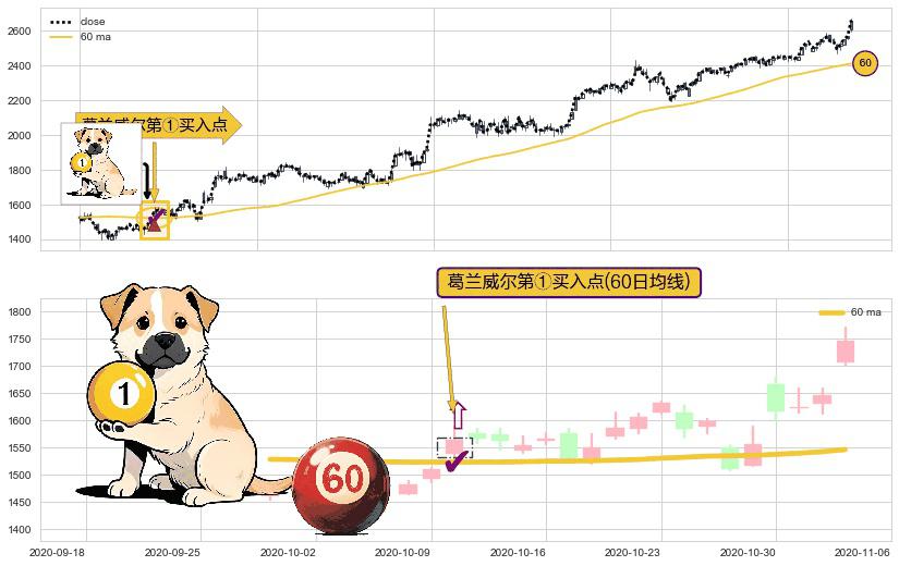 ⚀ 2020-10-12-日显现 葛兰威尔均线 60日均线 第买①入点 走势反转见底信号,后市看涨,买进信号