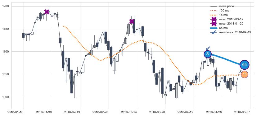 2018-01-16至2018-05-11 慢线与快线呈空头排列, 慢线与快线接触少,无缠绕
