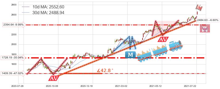 ♘ 支撑价格位2394.64,可信任强度61.67%,距离最后交易2021-07-23形成的收盘价格2660.30相差 -9.99%