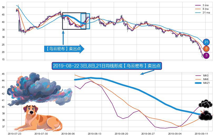 ⚀ 2019-08-06日-2019-09-10日显现 3日-8日-21日均线 【乌云密布】卖出点 看空信号,后市看跌,卖出