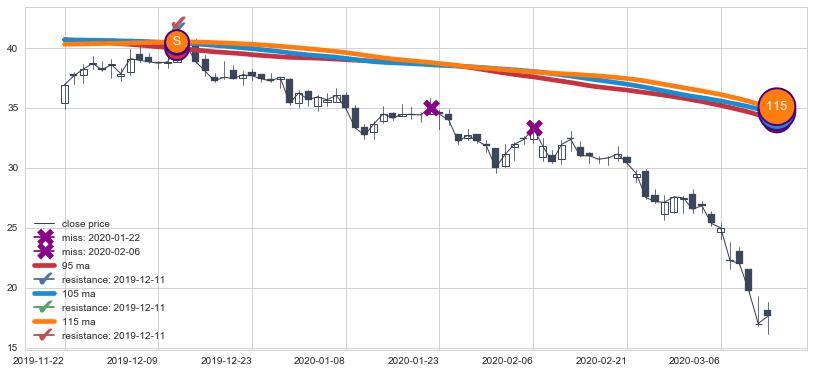 ⚅ 卖点向下突破均线后,价格走势有持续向下的迹象,但动能稍显不足,迟迟不能远离均线