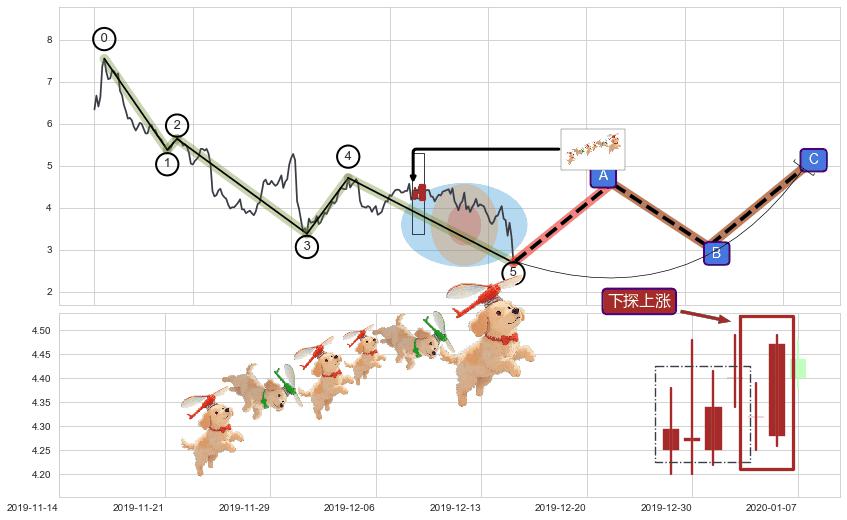 | 2 🅚:【高山滑雪】买入点 ➕ 🌊:波浪理论猜想下跌浪5已形成,猜想后续形成abc反弹上涨(均值回复) ☞ 看多信号 ⇥ 【均线】交织【图形】⇥ 综合量化分数: 52 | > |
