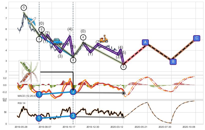➣ 第一, 三, 五浪下跌动能逐渐【衰弱变小】,趋势呈现不稳迹象