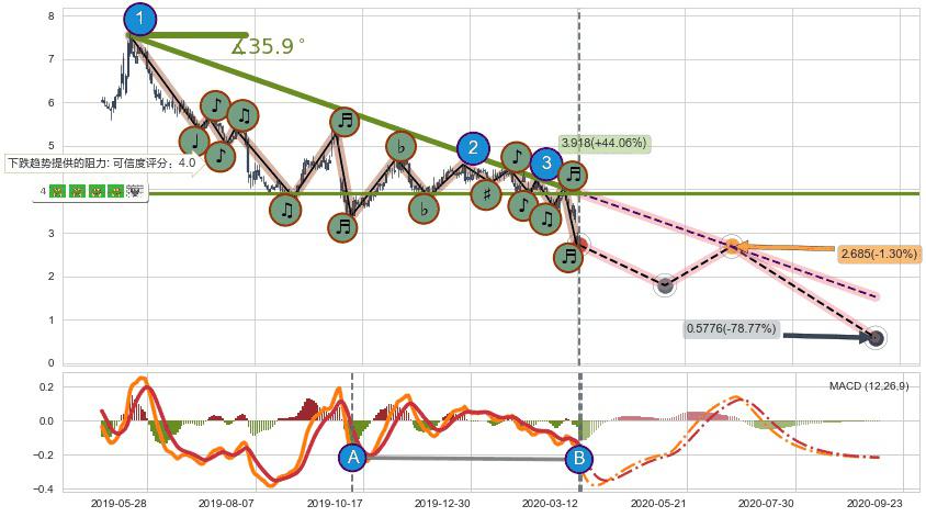 ♘ 在最后的下跌阶段2019-05-15至2020-03-13,存在 持续未破位的阻力位 ,阻力价格3.918,可信任强度84.92%,其距离最后价格2.720相差 +44.06%