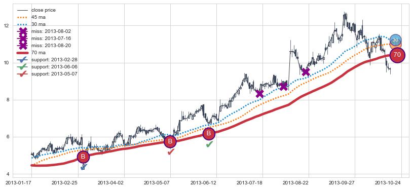 上涨趋势2013-01-17-2013-10-24,均线70确认关键支撑3处