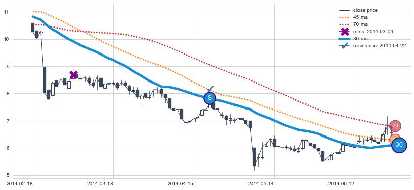 下跌趋势2014-02-18-2014-06-25,均线30确认关键阻力1处