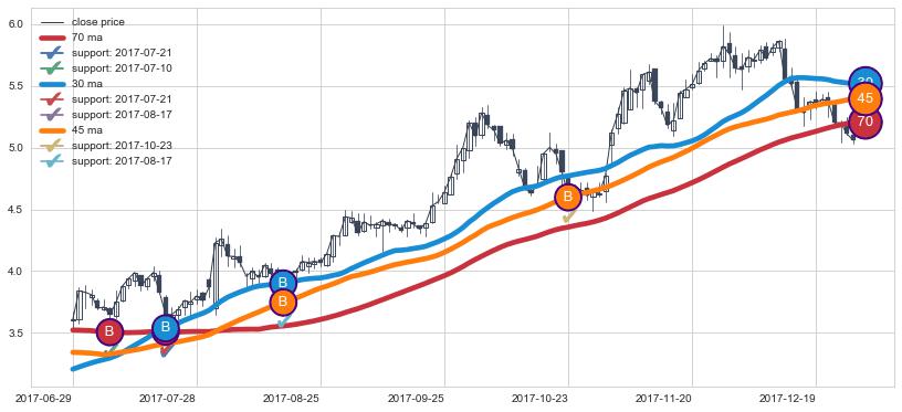 上涨趋势2017-06-29-2017-12-28,均线45, 70, 30确认关键支撑4处