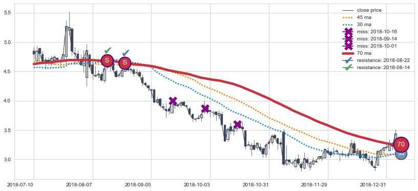 下跌趋势2018-07-10-2019-01-04,均线70确认关键阻力2处