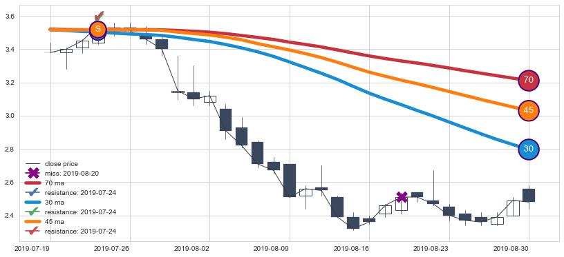 下跌趋势2019-07-19-2019-08-30,均线45, 70, 30确认关键阻力1处