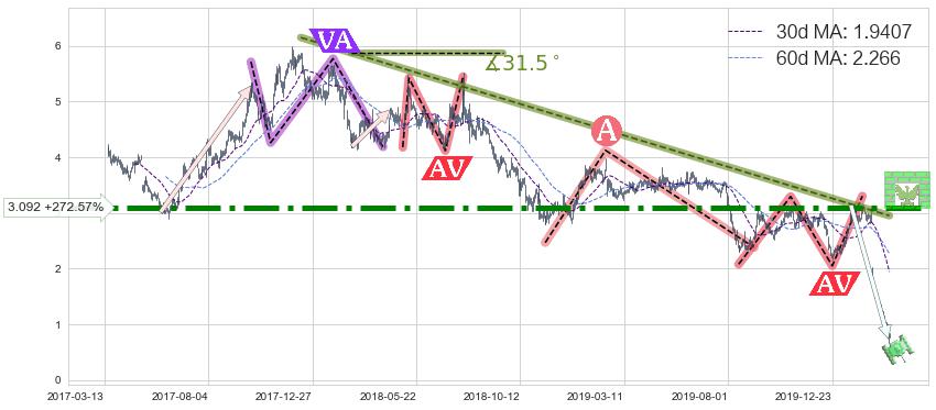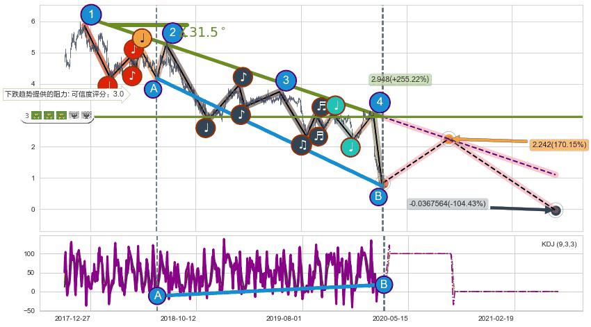 ♘ 在最后的下跌阶段2017-12-11至2020-03-13,存在 持续未破位的阻力位 ,阻力价格2.948,可信任强度73.69%,其距离最后价格0.8300相差 +255.22%