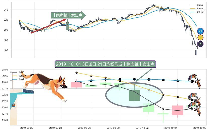 ⚀ 2019-10-01日显现 3日-8日-21日均线 【绝命跳】卖出点 看空信号,后市看跌,卖出
