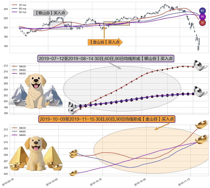 ⚀ 2019-10-10-日至2019-11-15-日显现 30日-60日-90日均线 【金山谷】买入点 其再次确认了买入信号,可靠性更强,买入