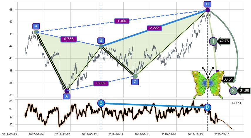 ➣ 已完成【蝴蝶】形态起点X: 2017-06-23, 终点D: 2020-01-17, 共647交易日