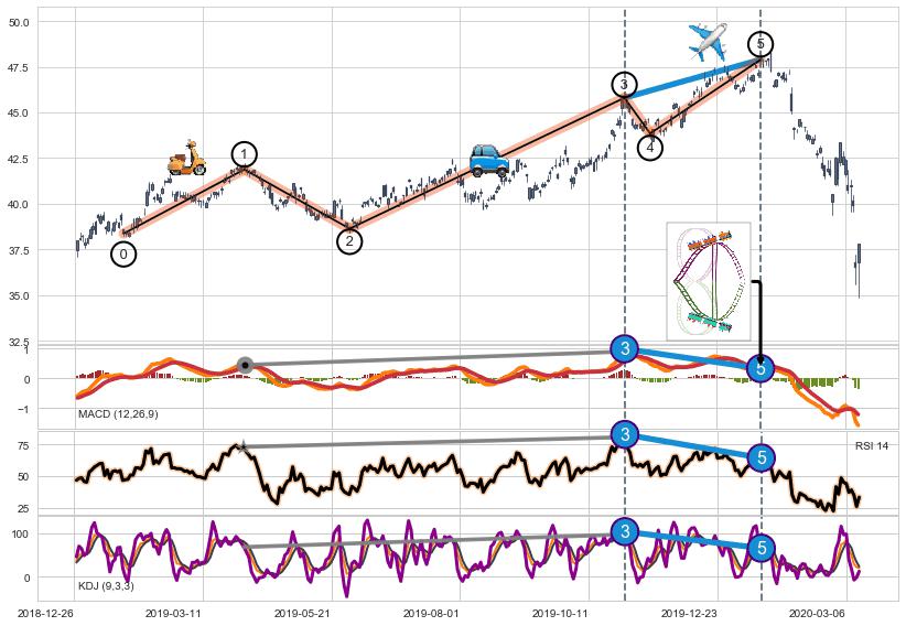 ➣ 1,3,5驱动浪MACD, RSI, KDJ走势都出现【常规背离】反转信号增强
