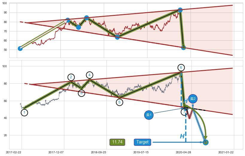 ➢ 最小反转跌幅→𝐇: 40.05 (逐步抬高阻力斜边最后的阻力点⑥与支撑边垂直距离)