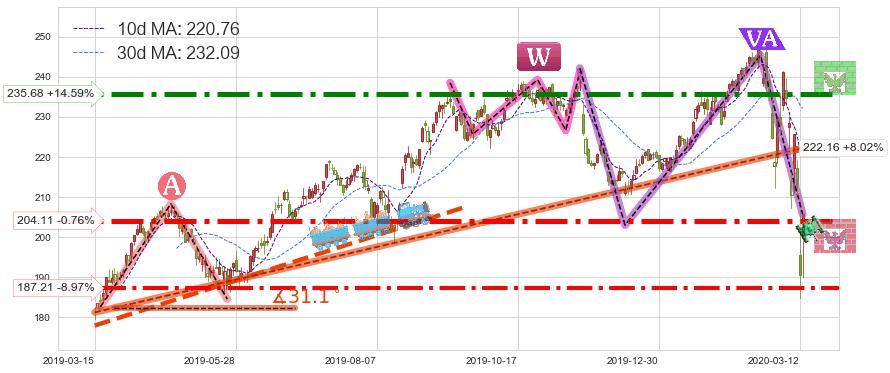♘ 支撑价格位204.11,可信任强度93.63%,距离最后交易2020-03-13形成的收盘价格205.67相差 -0.76%