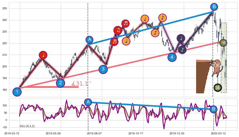 ✂️ 2019-03-15-2020-03-11上升趋势存在反转[风险],其原上升趋势的支撑位(222.16)已破位[强阻力信号],原上升趋势角度: 31.1˚