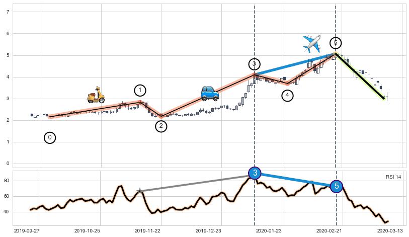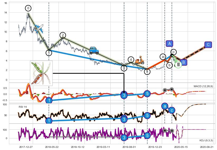 ➣ 1,3,5驱动浪MACD, RSI, KDJ走势都出现【常规背离】反转信号增强