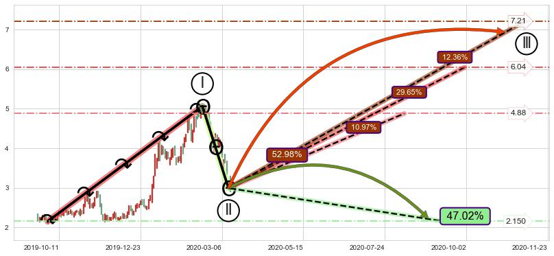 ➣ 最小中继整理跌幅→𝐇: 4.62 (下侧直角边第一支撑点②与斜边垂直距离)