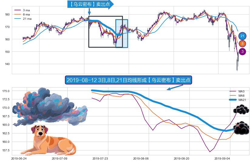 ⚃ 【乌云密布】卖出点长时间对 牛 市转 熊 市进行确认,且均线压制价格走势,但信号发出时间较长,属于【迟滞】看空卖出信号