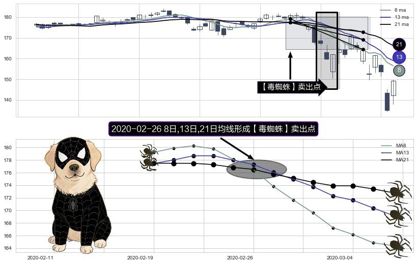 形态多维评估: ⚀ 2020-02-26日显现 8日-13日-21日均线 【毒蜘蛛】卖出点 看空信号,后市看跌,卖出
