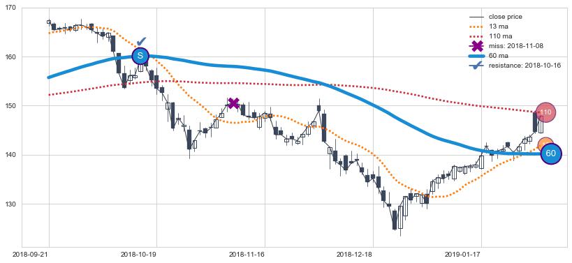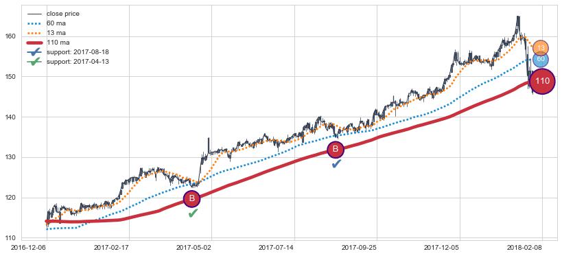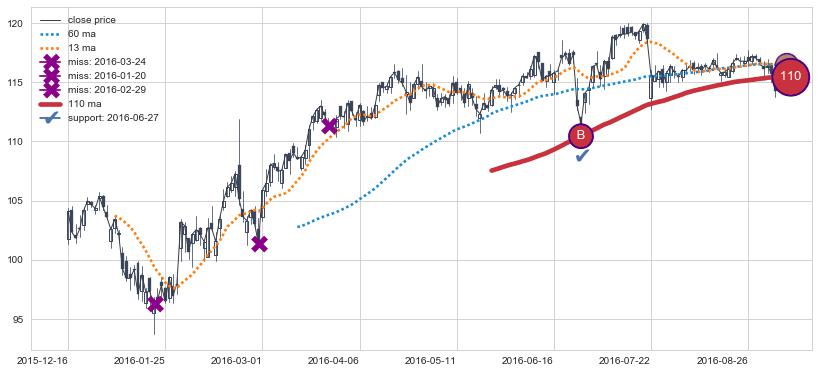 上涨趋势2016-12-06-2018-02-08,均线110确认关键支撑2处