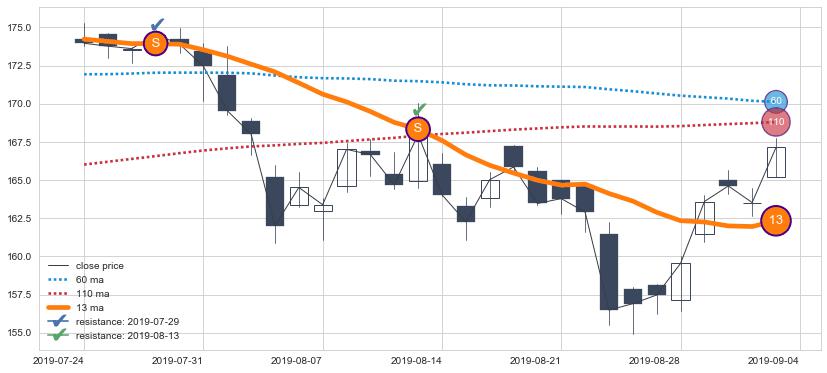 下跌趋势2019-07-24-2019-09-04,均线13确认关键阻力2处