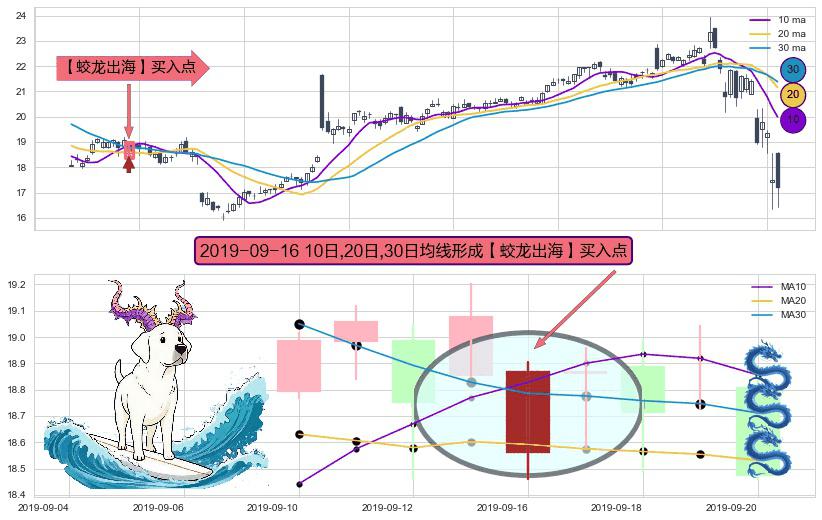 ⚄ 【蛟龙出海】买入点长时间对 熊 市转 牛 市进行确认,且均线烘托价格走势,但信号发出时间较长,属于【迟滞】看多买入信号