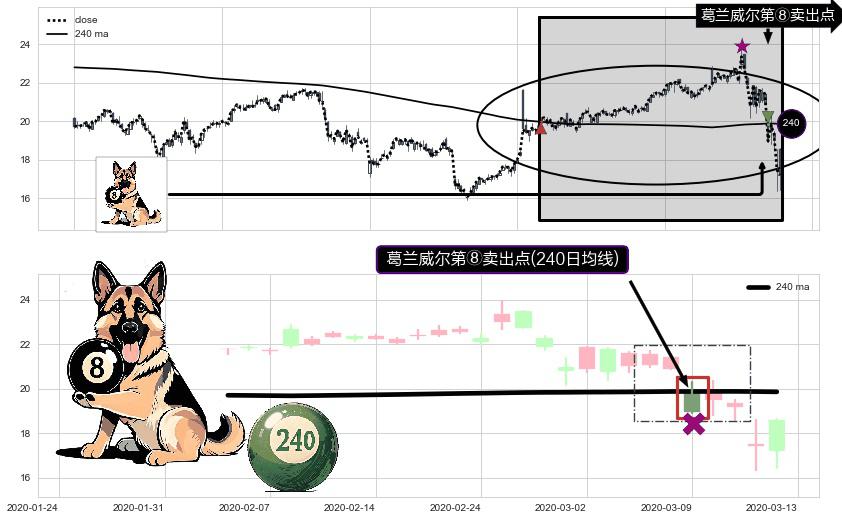 形态多维评估: ⚀ 2020-03-09-日显现 葛兰威尔均线 240日均线 第⑧卖出点 下降趋势的中继信号,后市看跌,卖出信号