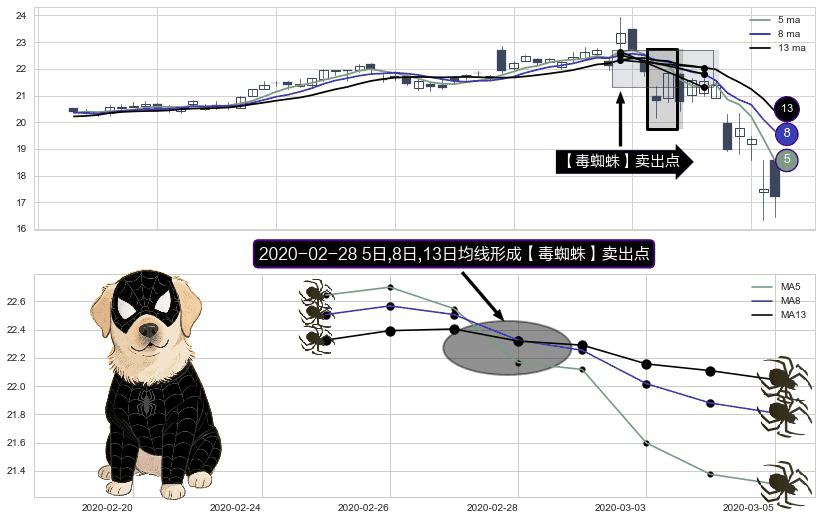 形态多维评估: ⚀ 2020-02-28日显现 5日-8日-13日均线 【毒蜘蛛】卖出点 看空信号,后市看跌,卖出