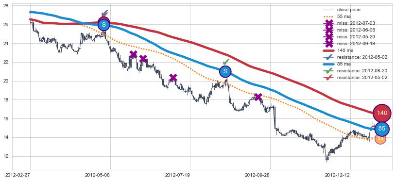 下跌趋势2012-02-27-2013-01-04,均线140, 85确认关键阻力2处